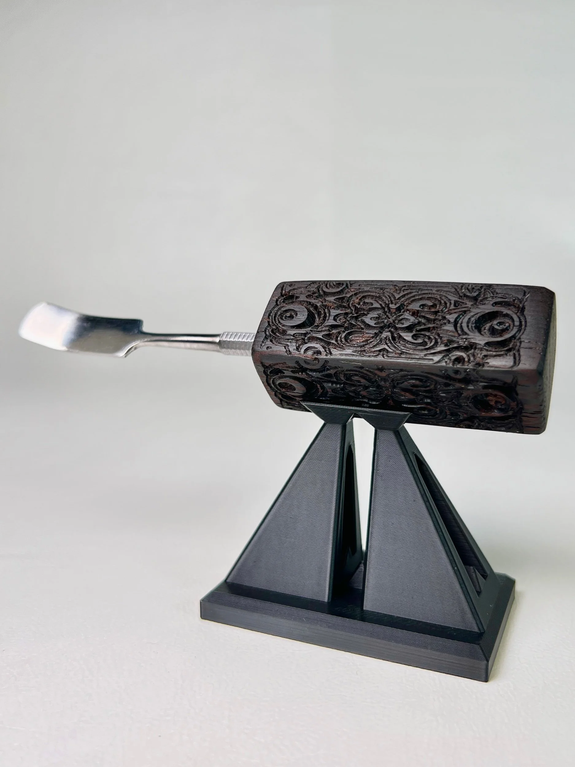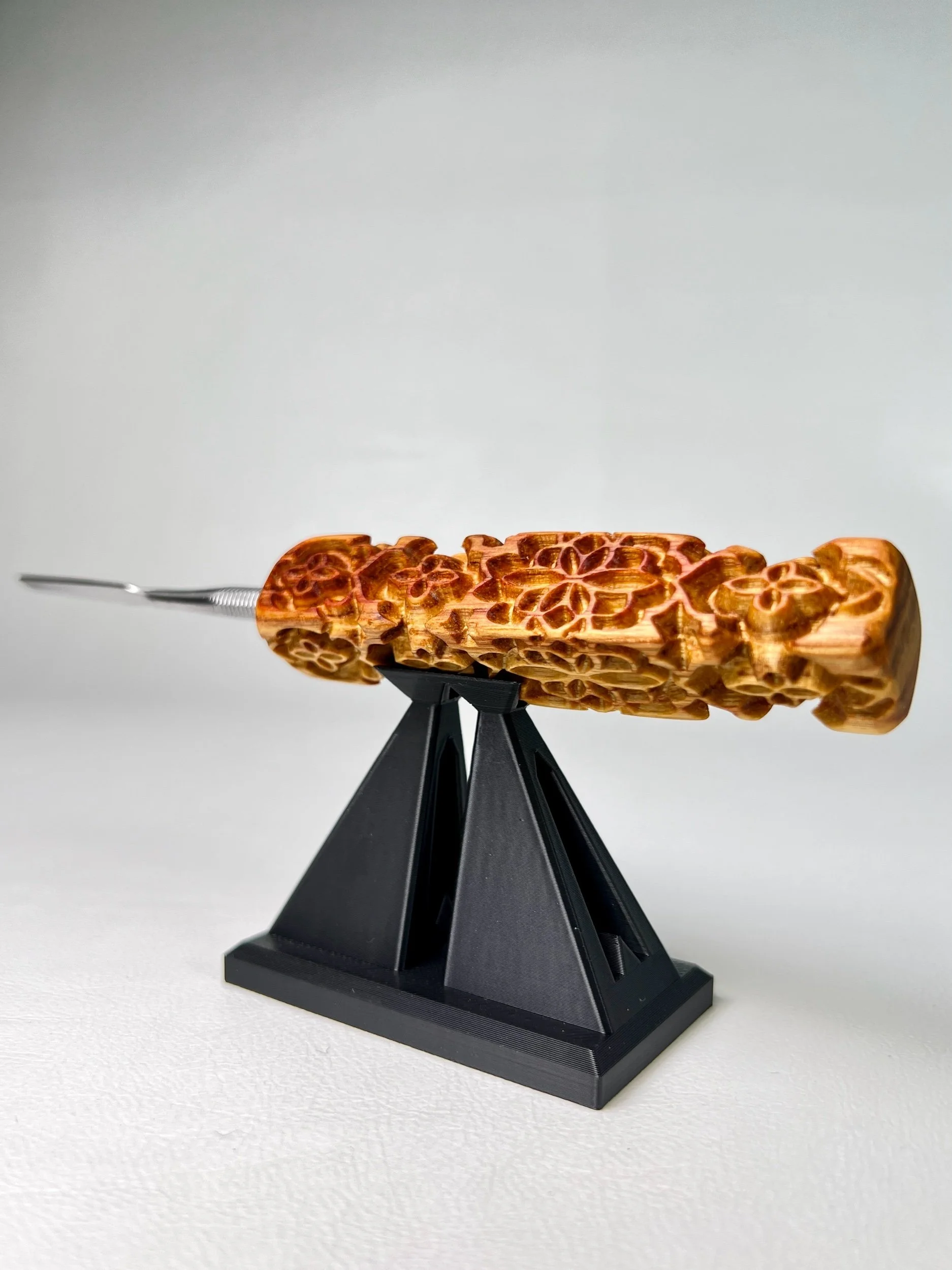 What it lacks in length, it makes up for in width. This wooden Wenge handle has a dual mirrored engraving with what appears to be 2 eyes, but you’ll have to see for yourself.