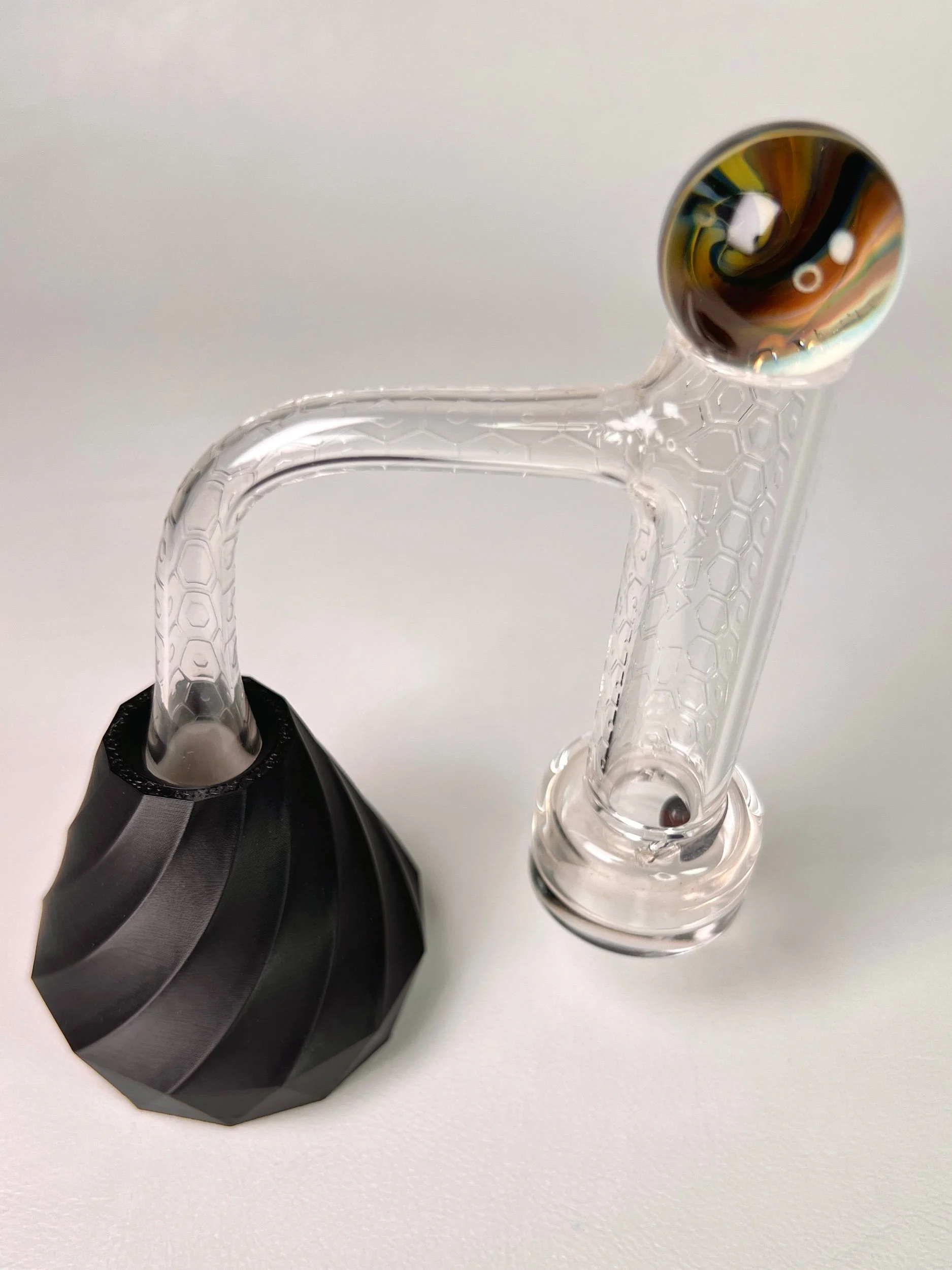 This design draws inspiration from the inside of a firearms barrel particularly that of a 007 adversary just before death. The flared base allows for counter weights to be discreetly placed at strategic locations to ensure a stable, yet minimal footprint. Suitable for all sizes of 14/90 bangers.