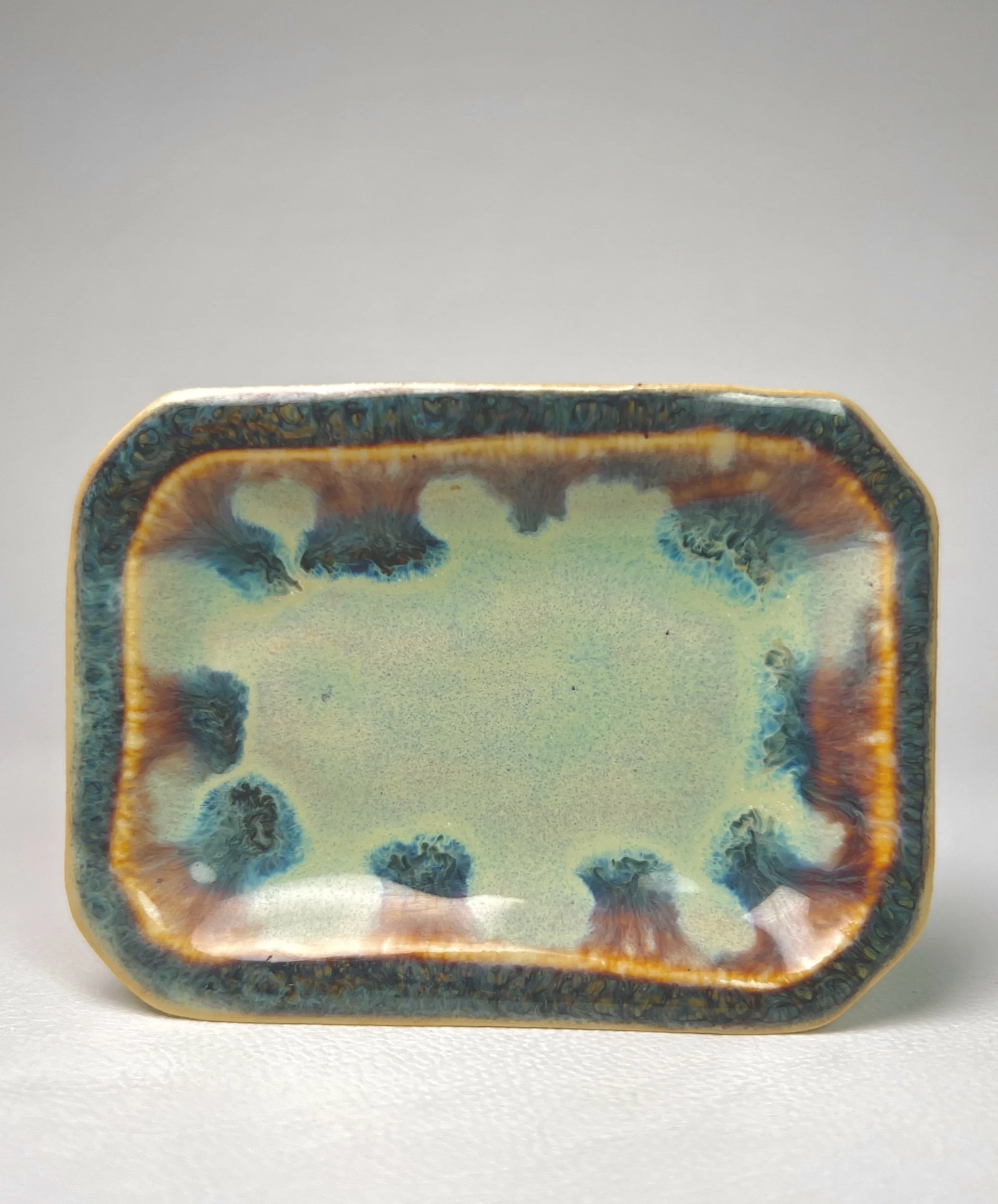 Originally created for cigars, this ash tray is perfect for larger hash holes and Amish doinks. Designed to hold a freshly sparked joint, it’s elevated by a hexagonal texture fused into the surface — creating natural breaks and ridges where the glaze forms 1/1 patterns. Named “Sundaze,” because its twin extensions mirror the shape of a banana split dish — and yes, it’s fired hot enough to be food-safe if you ever felt like using it as one.